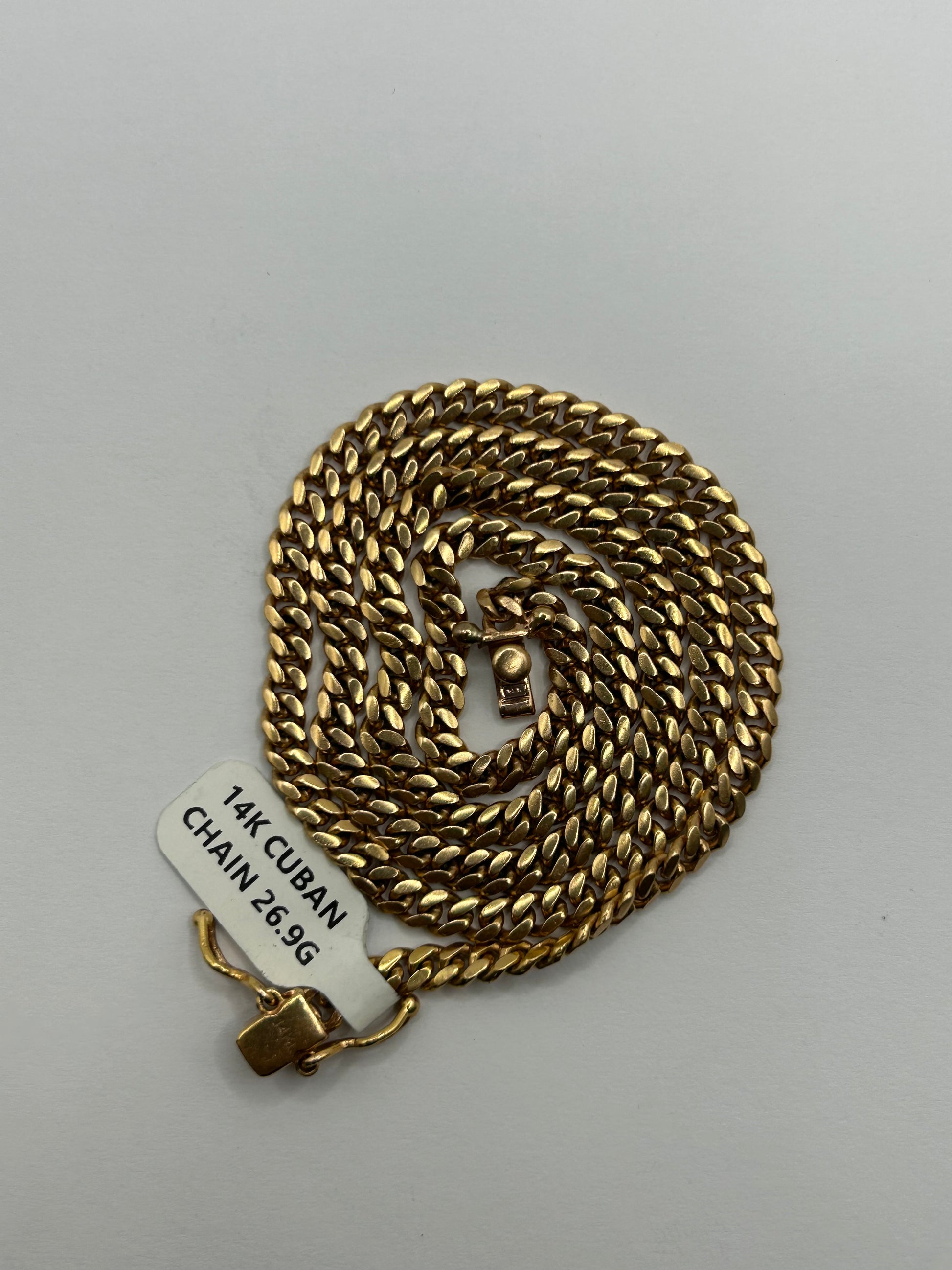 This solid 14 karat rose gold Cuban link chain (58.5% purity) blends luxury with strength. The warm pinkish hue of rose gold offers a modern twist on a classic, while the bold Cuban link design ensures durability and timeless style. At 26.2 grams, this chain carries noticeable weight, giving it a premium feel and presence.